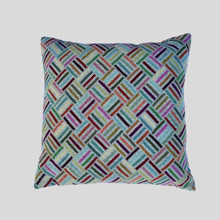 Puden sys med hele korssting i uldgarn på en brun stramaj med 4,4 sting pr. cm.