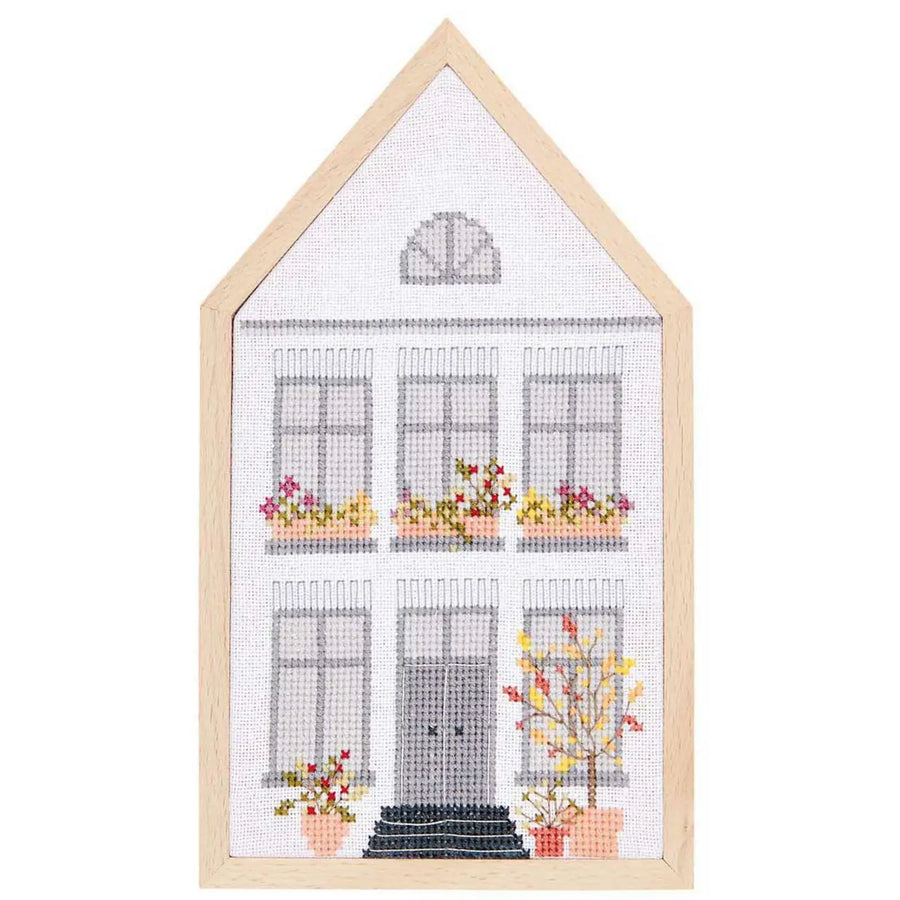 Oplev den charmerende elegance i dette smukke broderisæt fra Rico Design. Dette detaljerede broderi viser et pænt hus med efterårsplanter og vinduer, perfekt indrammet i en husformet træramme.