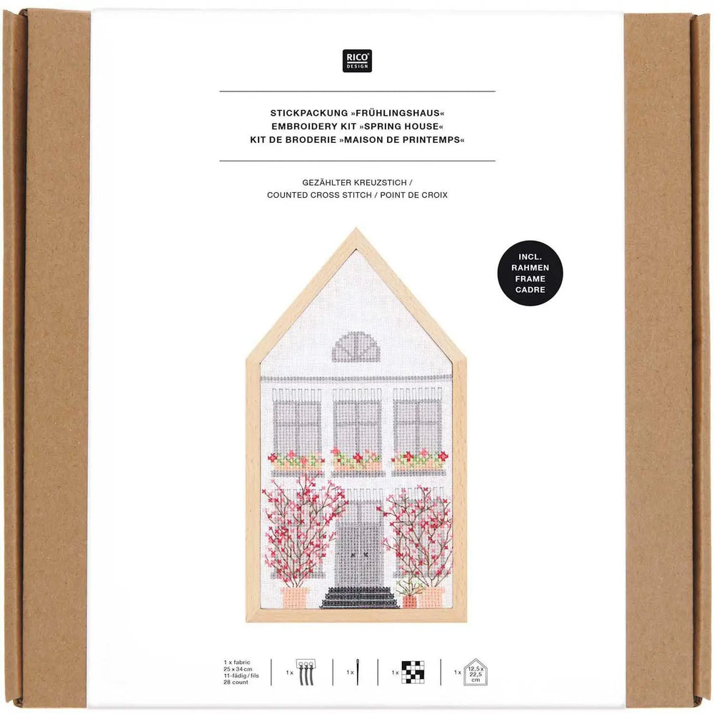 Oplev den charmerende elegance i dette smukke broderisæt fra Rico Design. Dette detaljerede broderi viser et pænt hus med forårsplanter og vinduer, perfekt indrammet i en husformet træramme.