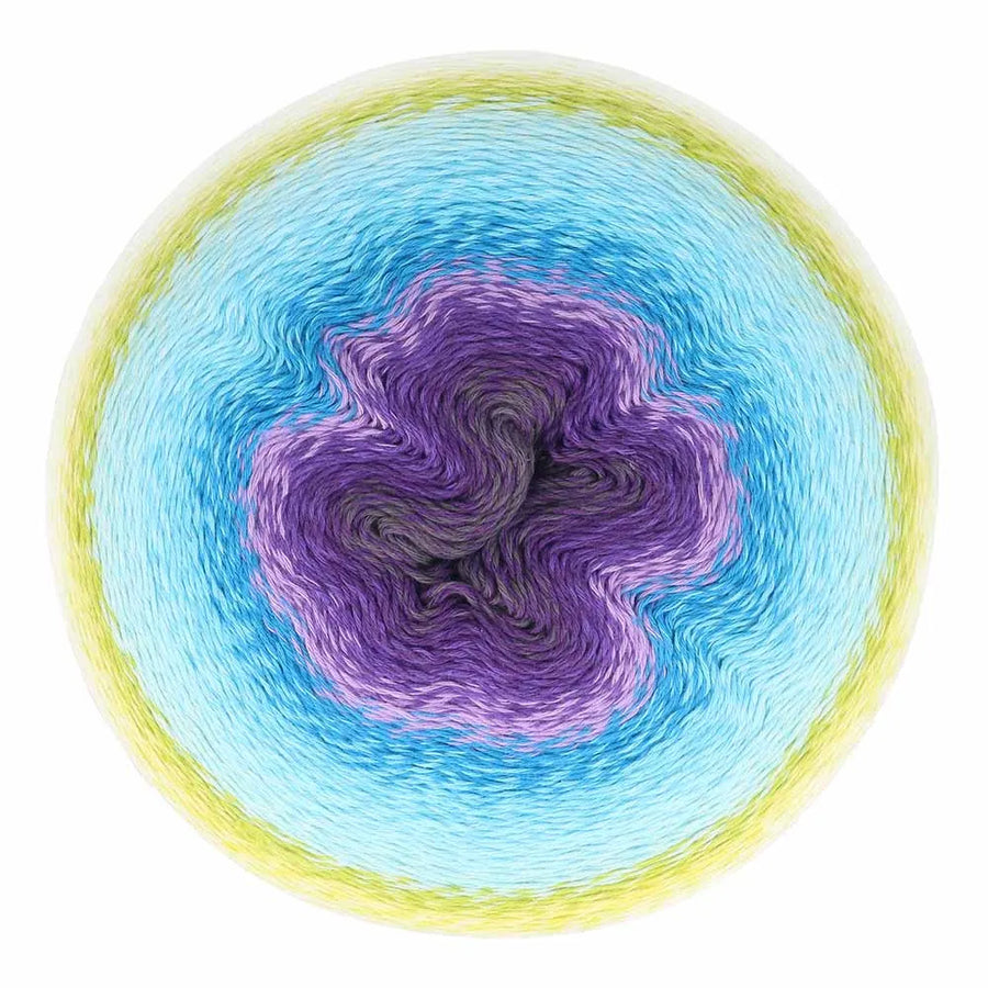 Noctura tager dig med på en farverejsenat gennem drømmelandskaber. Fra dyb lilla og lavendel i kernen, over kølige blå nuancer og ud til en livlig limegul kant, skaber farvespillet en eventyrlig og næsten magisk stemning. Det er en farvekombination, der gør sig fantastisk i projekter med bevægelse og flow – tænk luftige sjaler, ponchoer eller lette sommertæpper, hvor farverne får lov at folde sig ud over mange meter.