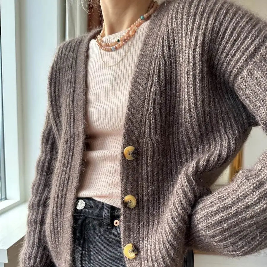 Materialer:300-350 (350) 350-400 (400) 400 (450) 450 (500) 500-550 Tynn Peer Gynt fra Sandnes Garn (50 g = 205 m) strikkes sammen med 150-175 (175) 175-200 (200) 200 (225) 225 (250) 250-275 g Tynn Silk Mohair fra Sandnes Garn (25 g = 212 m), 4 knapper (Ø = 22-23 mm)